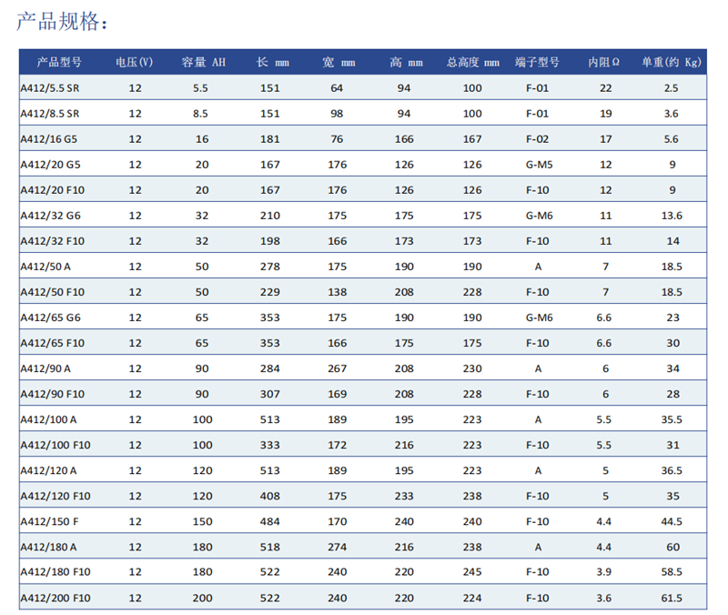 阳光蓄电池A412系列产品,采用高纯度的原材料,自放电小,具有良好的耐过放电,恢复能力好。